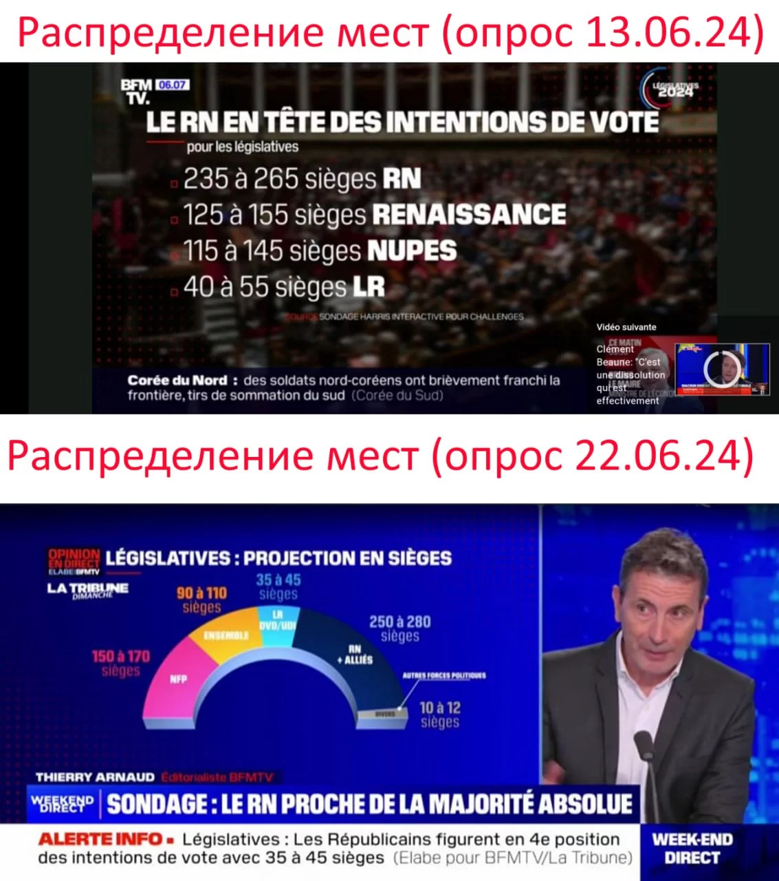 Третьими все еще идут «макронисты», но они стремительно теряют поддержку и соответственно мандаты (примерно минус 30 за 9 дней), что ставит крест на любых амбициях их лидера.