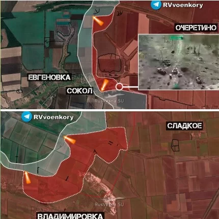 ▪️На Покровском направлении группировка войск "Центр" продвинулась в восточной части Евгеновки и северо-восточнее вдоль лесополосы на участке шириной до 1.3 км.