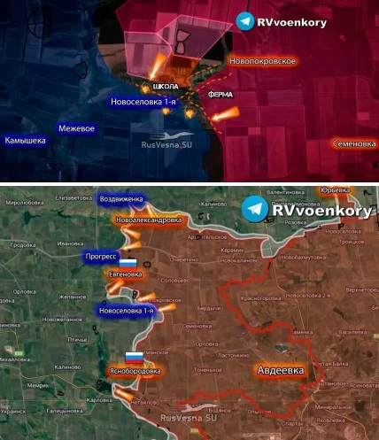 Утром они писали, что "Севернее и восточнее Новосёловки Первой ВС РФ продвинулись на участке шириной до 5 км на глубину до 1.2 км, заняв оставшуюся часть северной фермы и начав штурмовые действия на севере и востоке села".